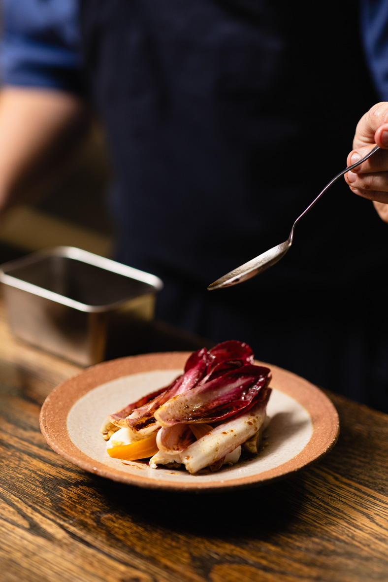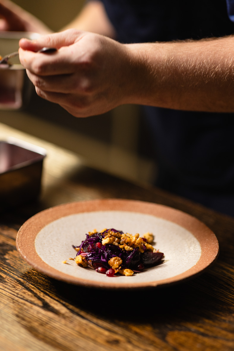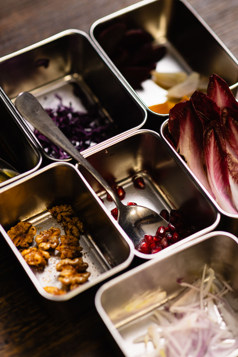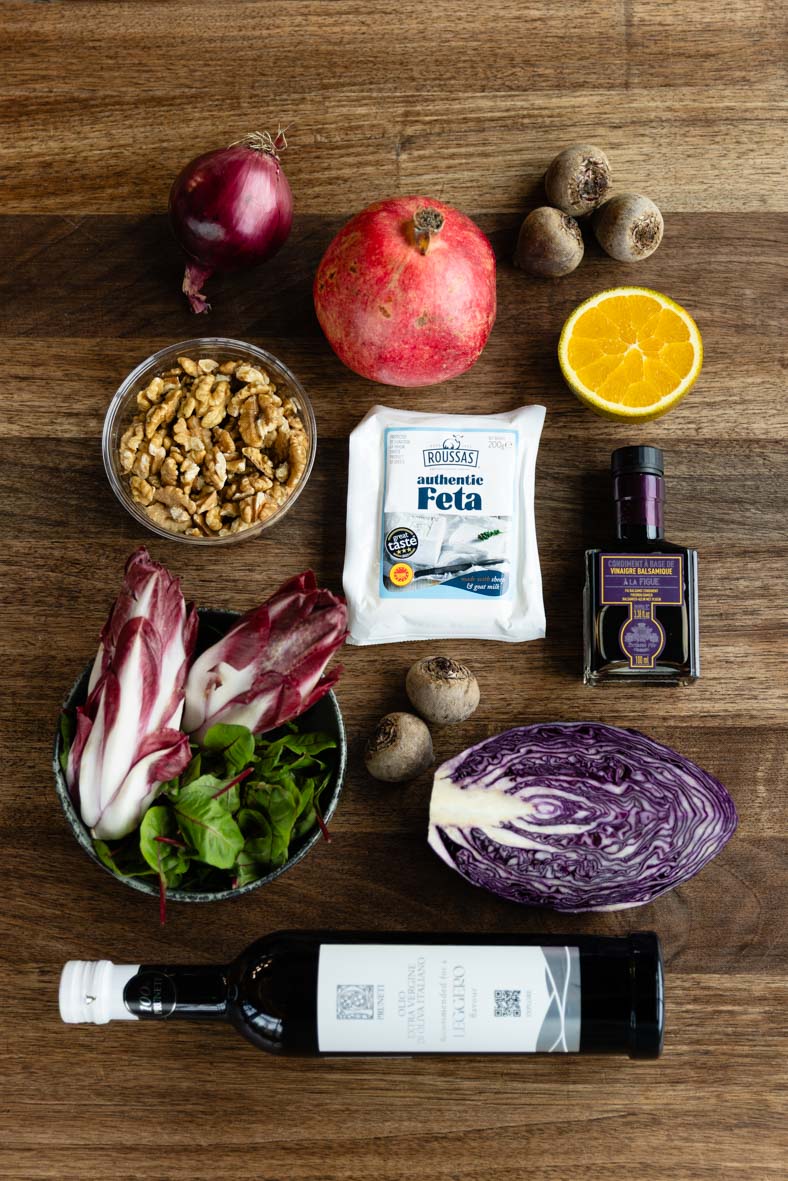 Викладаємо на тарілку фету, синю капусту, мангольд, гранат та горіхи, зверху — листя цикорію, додаємо сіль та заправку. Готово!