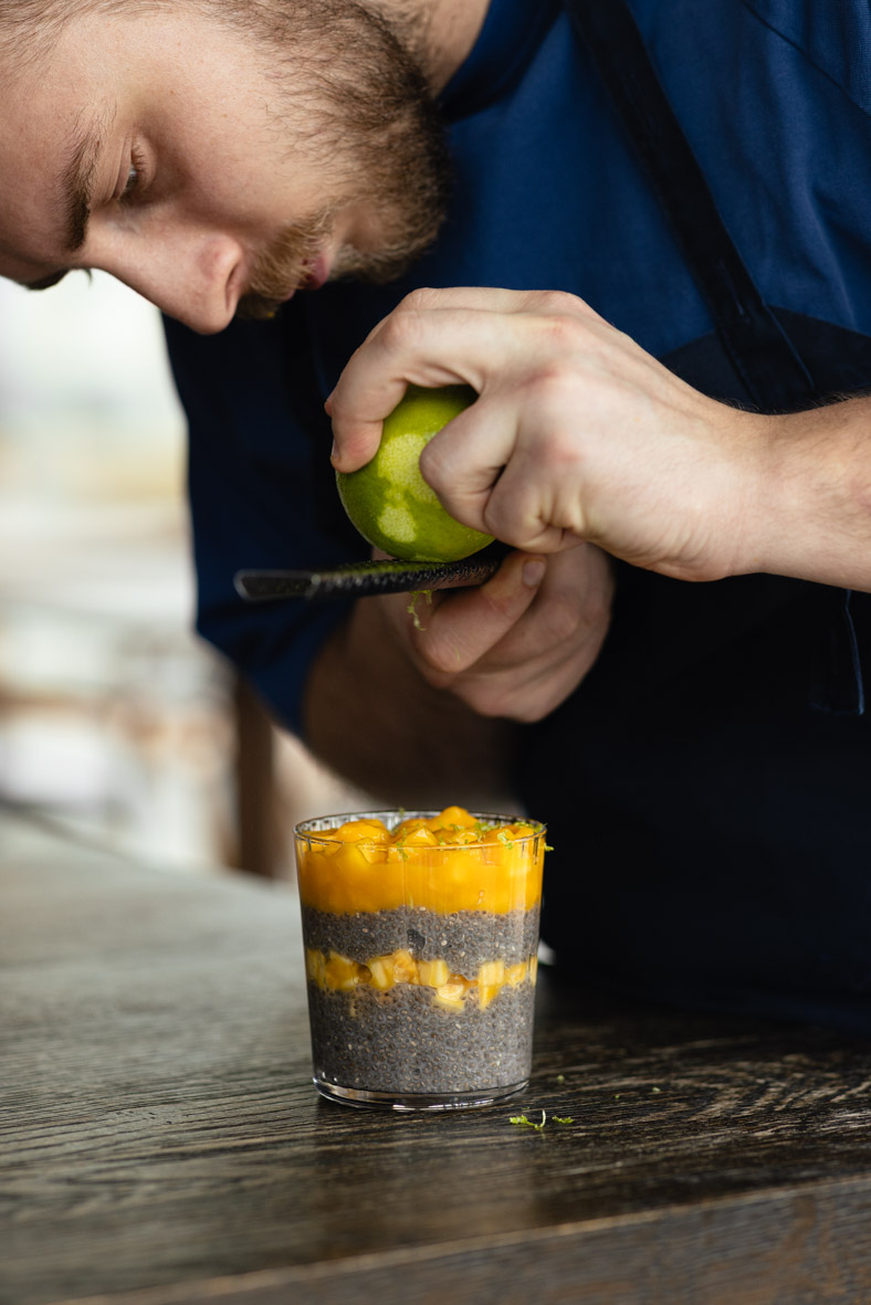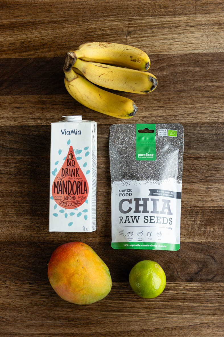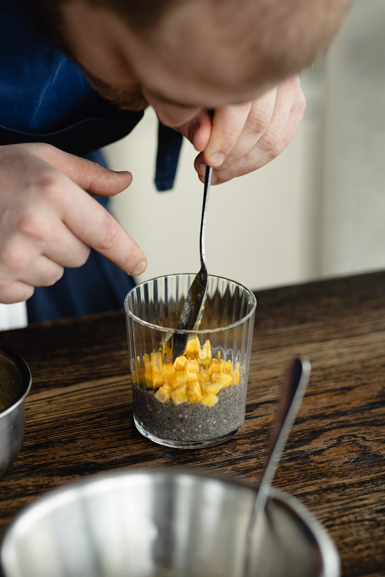 Викладаємо шарами: чіа, банан із манго-пюре, чіа, манго з манго-пюре.