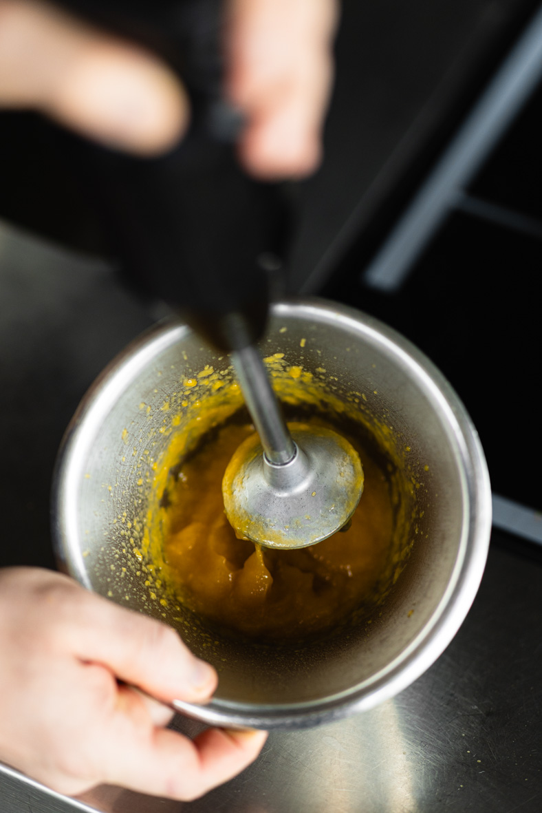 Усе інше, що залишилося, викладаємо в невеликий сотейник, трохи проварюємо, поки манго повністю не розм’якне, і перебиваємо в однорідне пюре. Даємо охолонути. За потреби перебиваємо блендером. Вмішуємо в пюре нарізане манго й банан.