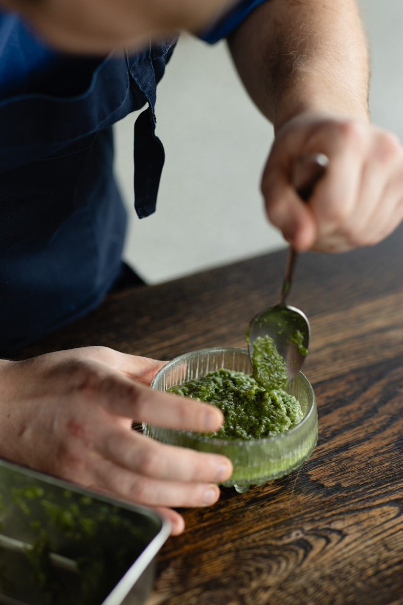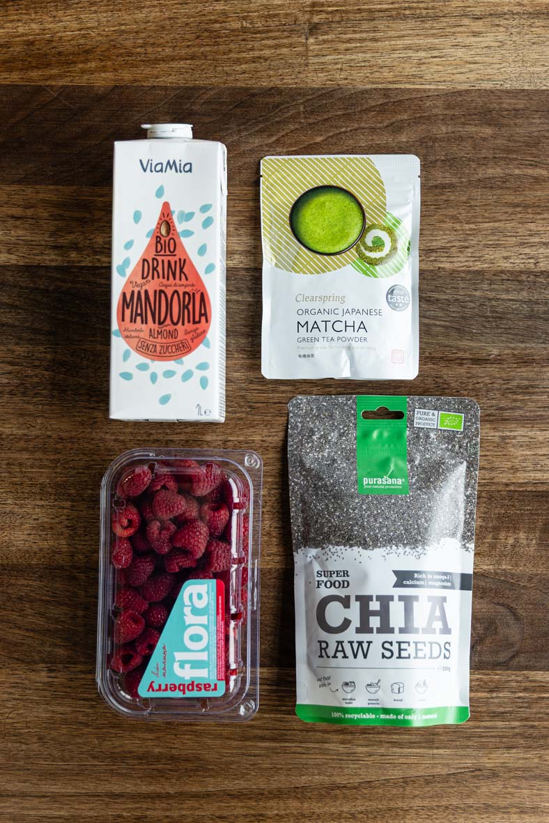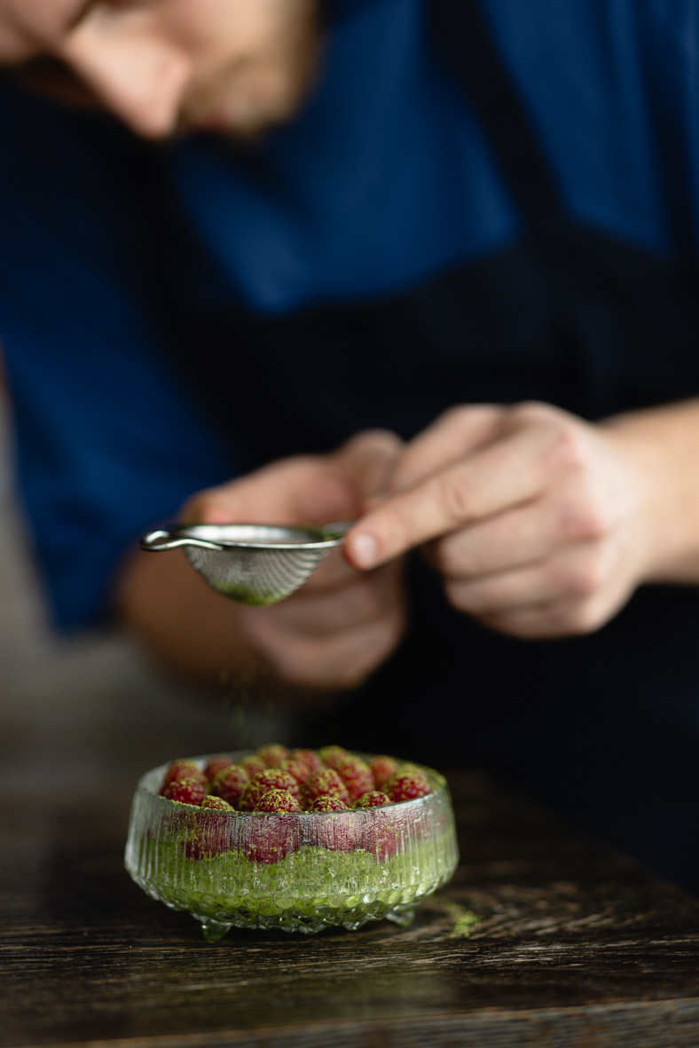 Викладаємо малину, притрушуємо зверху порошком матчі — і готово.