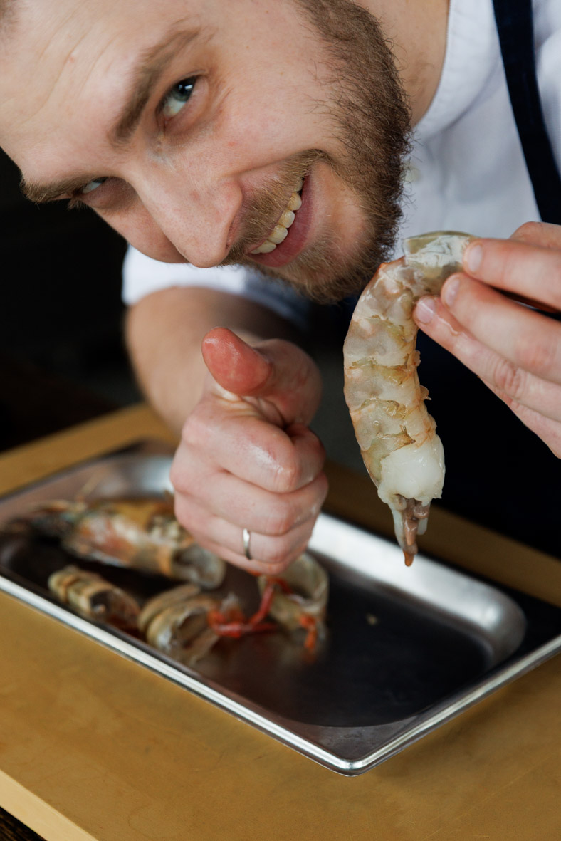 Чистимо креветку та розрізаємо вздовдж.