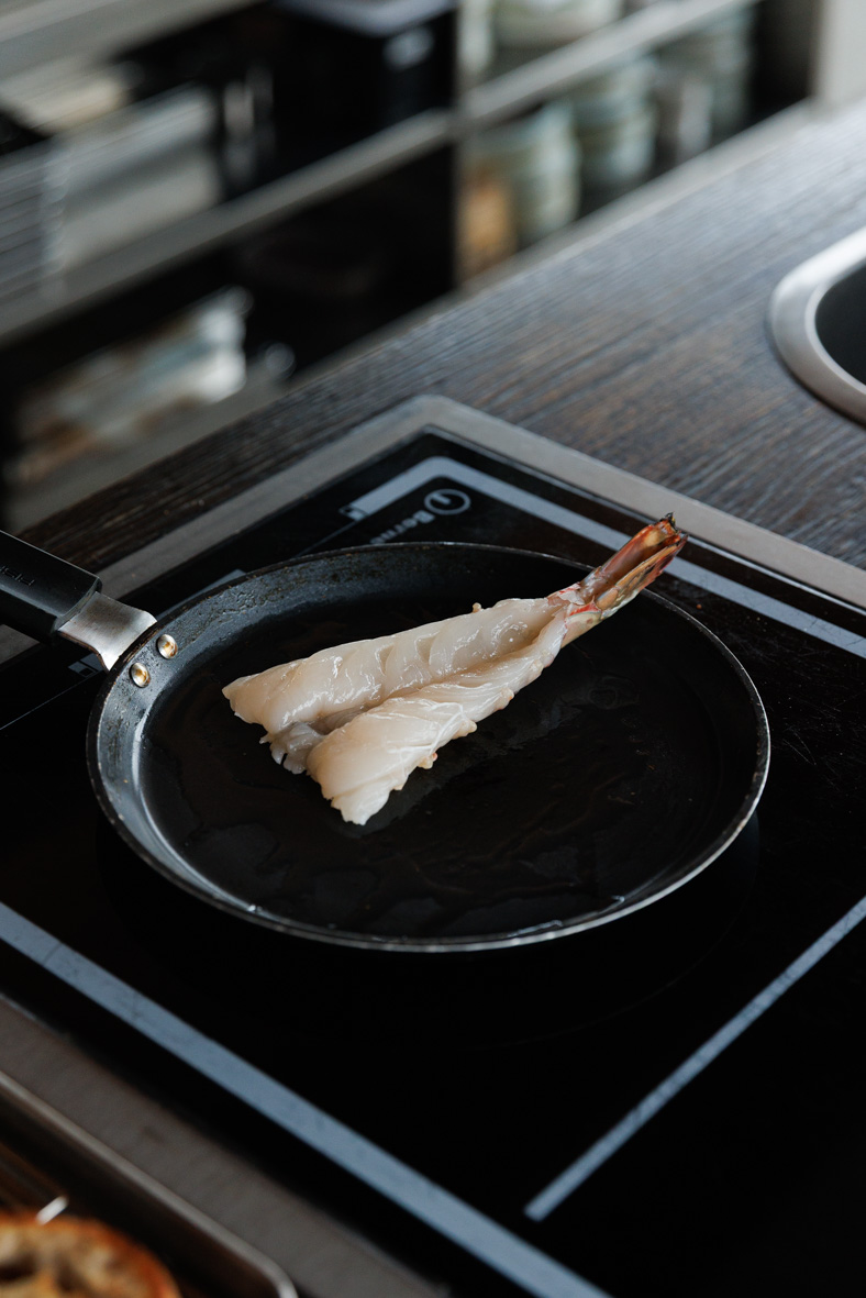 Обсмажуємо креветку на пательні протягом декількох хвилин до стану готовності.