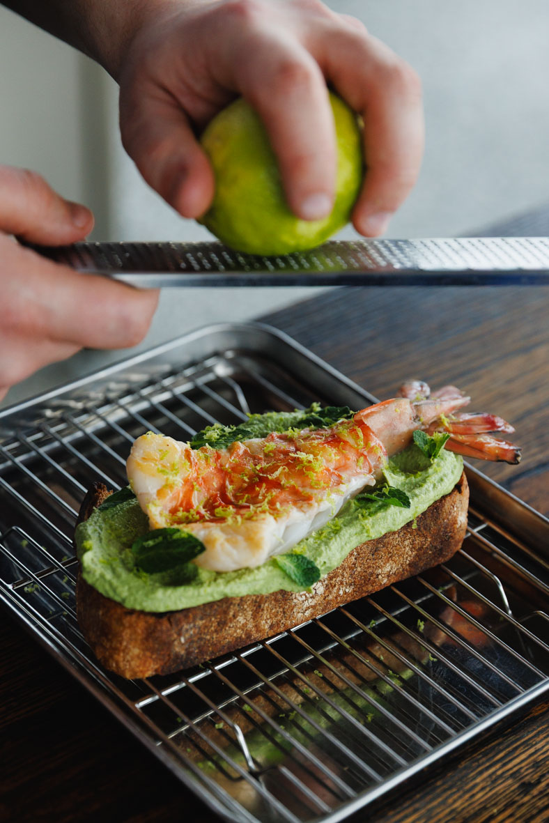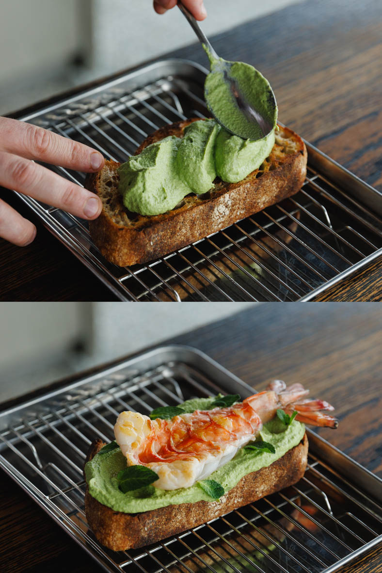 Змащуємо тост пастою з едамаме. Викладаємо креветку, прикрашаємо зверху м'ятою.