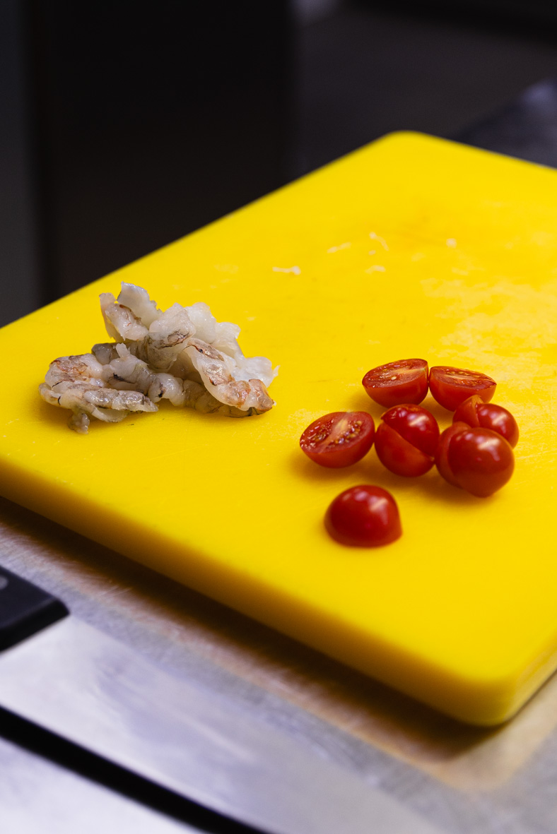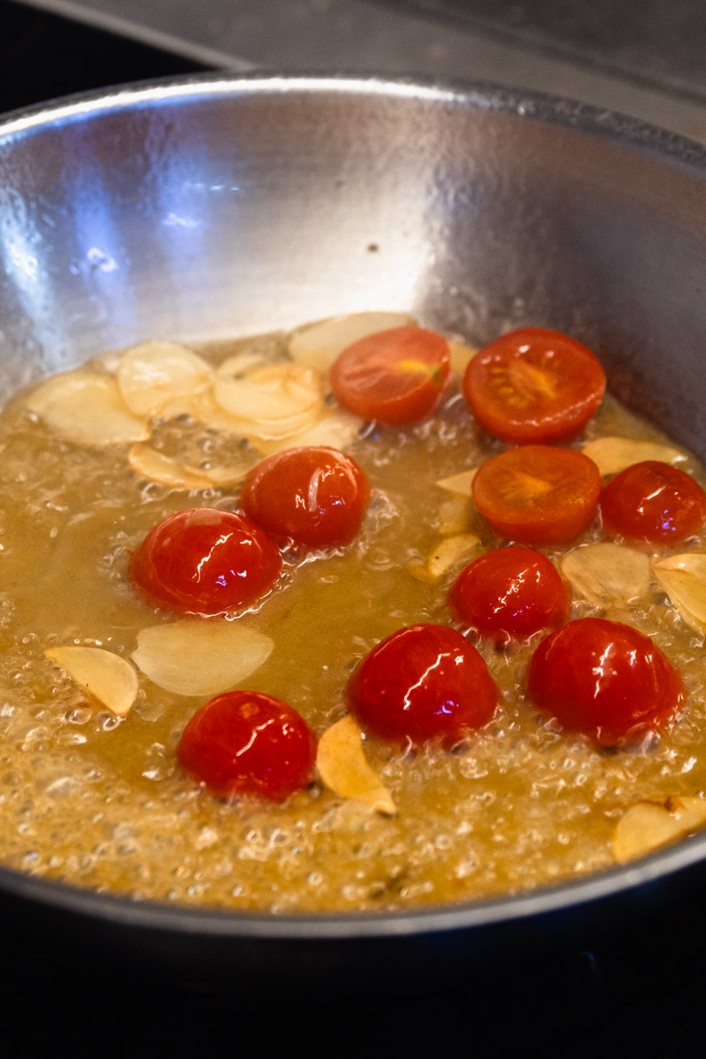 Підготовлюємо всі інгредієнти. На розігріту пательню наливаємо оливкову олію, даємо розігрітися додаємо часник та томати черрі.