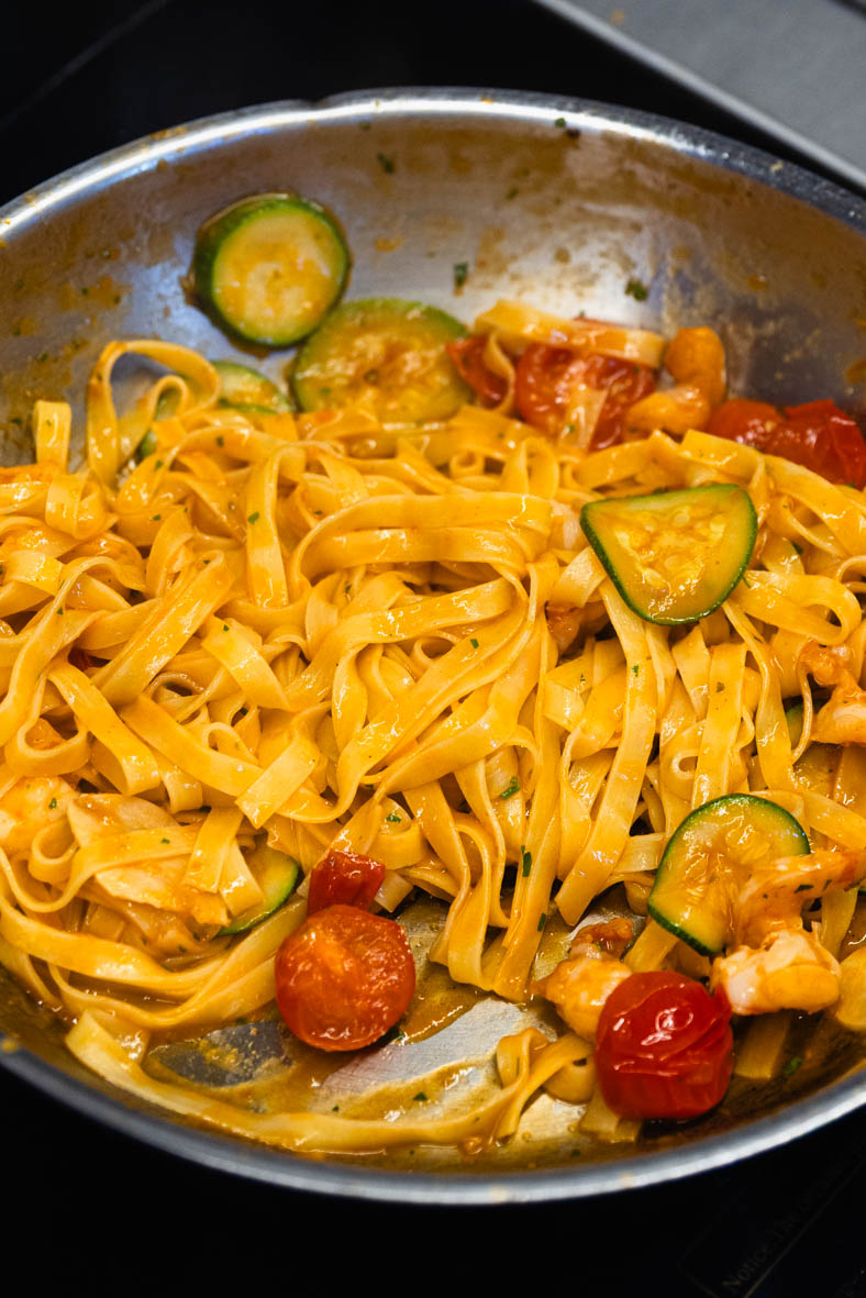 Додаємо нарізаний кільцями цукіні. Потім додаємо обсмажену на оливковій олії почищену та розрізану навпіл креветку. Солимо і перчимо. Додаємо трохи води, в якій варилися фетучіні, та зварену пасту. Перемішуємо, додаємо мілко різану петрушку, за потреби додаємо сіль.