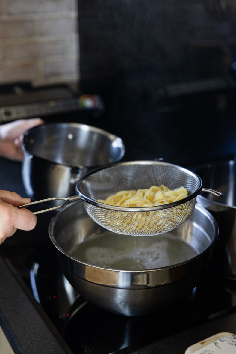Варимо пасту у киплячій воді на 2 хвилини менше, ніж вказано на пакуванні. Після цього перекидаємо в друшляк і промиваємо під холодною водою. Просушуємо сухими рушниками.