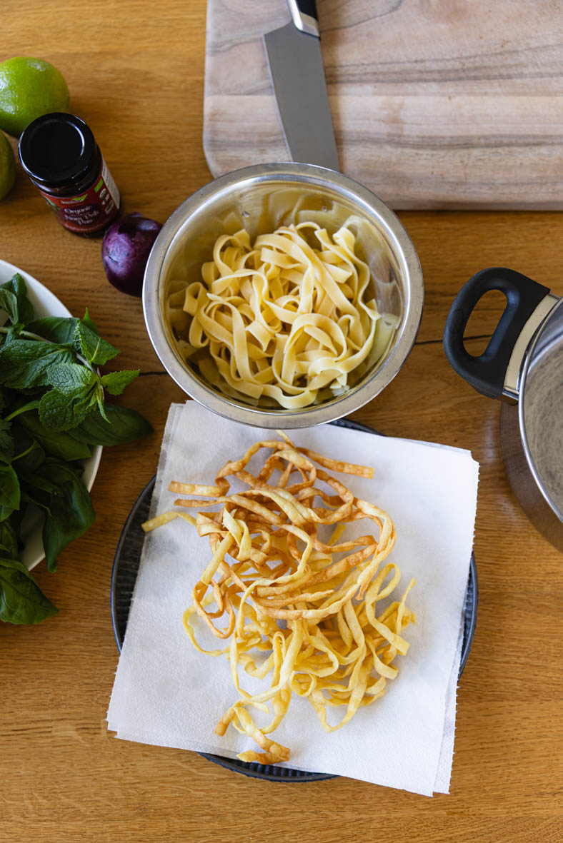 У каструлю або сотейник наливаємо соняшникову олію, розігріваємо до 180 °C і обсмажуємо половину вареної локшини близько 2 хвилин — до хрумкої текстури й яскраво-жовтого кольору. За допомогою сита перекладаємо локшину на сухий рушник, щоб він увібрав зайвий жир.