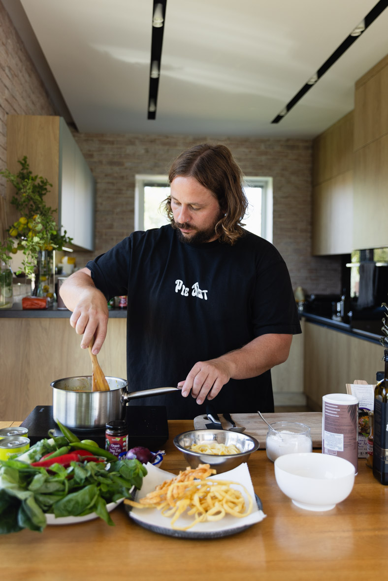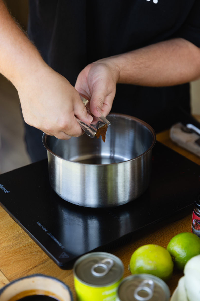 У сотейнику на соняшниковій олії обсмажуємо пасту Као Сой близько 2 хвилин. Додаємо куркуму та карі й, постійно помішуючи, смажимо ще 2 хвилини на маленькому вогні. Потім додаємо рибний і соєвий соуси, перемішуємо, додаємо сіль і кокосовий цукор, обсмажуємо ще хвилину.