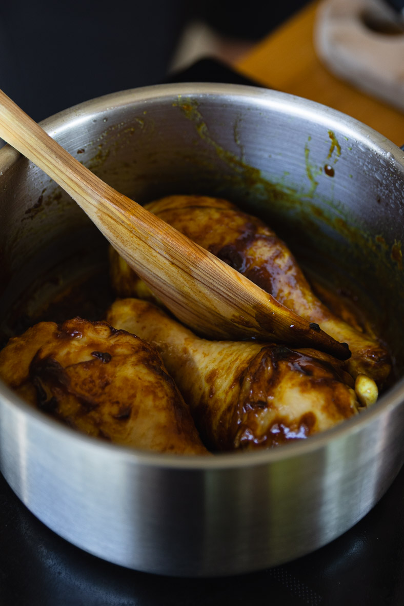 Додаємо курячі ніжки й смажимо, постійно помішуючи, близько 5 хвилин, щоб м’ясо увібрало смак пасти та спецій.