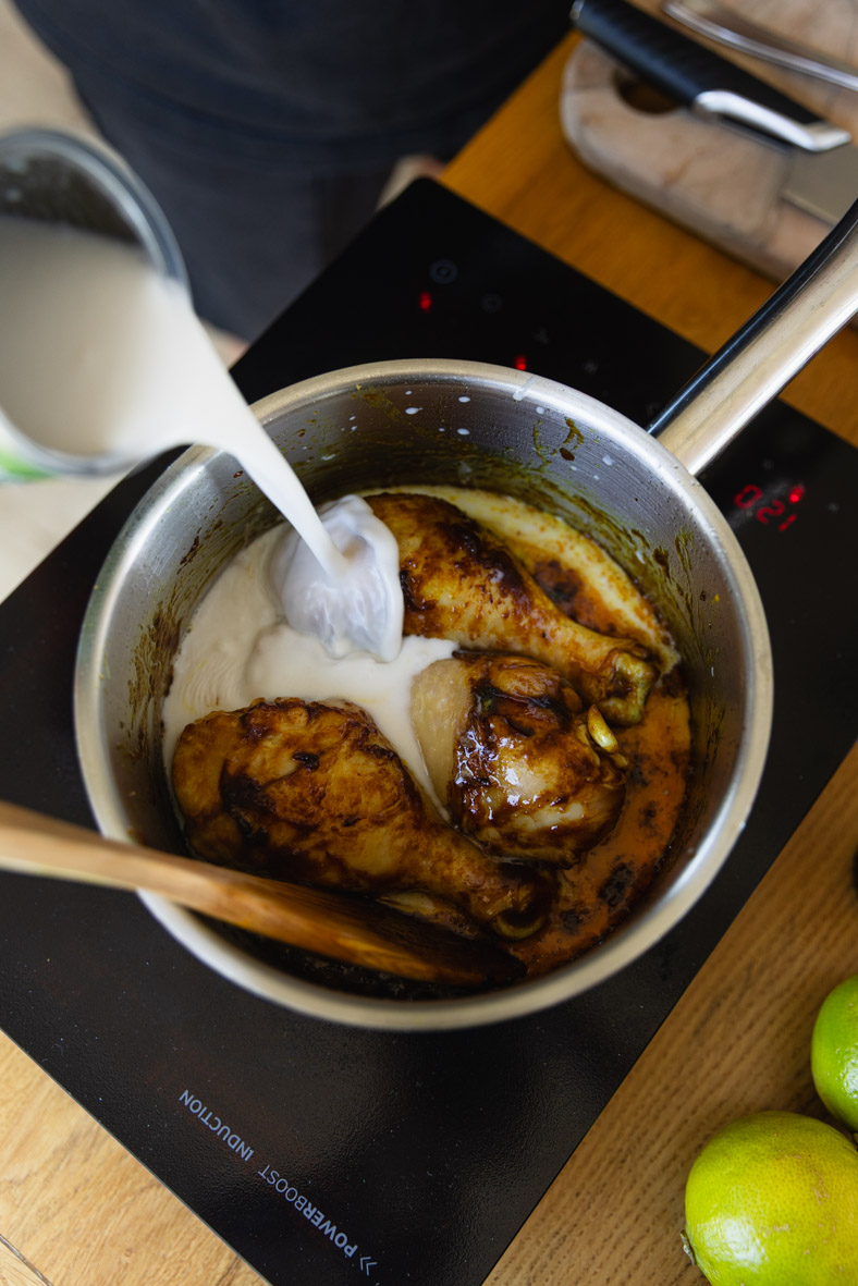 Вливаємо кокосове молоко, доводимо до кипіння й варимо 40–45 хвилин — до готовності курки. М’ясо має легко відділятися від кістки.