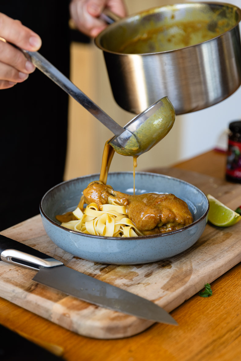 Нагріваємо варену локшину в киплячій воді близько 30 секунд. Викладаємо на тарілку, зверху кладемо курячу ніжку та заливаємо карі, який залишився у сотейнику. Додаємо смажену у фритюрі локшину та прикрашаємо розшарованими кокосовими вершками.