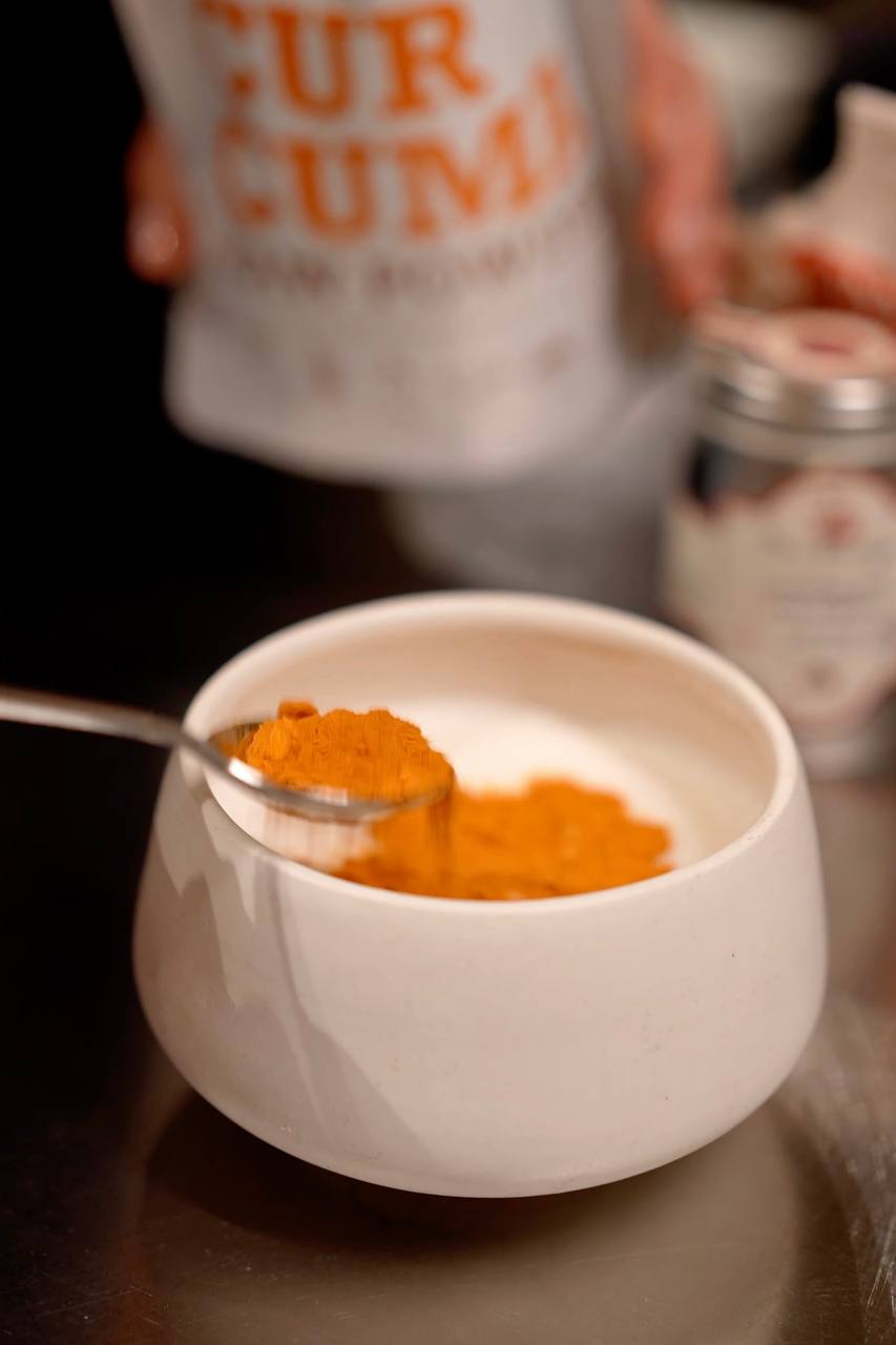 Куркумін погано засвоюється у воді, тому потрібні жири, які допомагають куркуміну потрапити у кров через ліпідні канали. Імбир, кориця, мускатний горіх діють синергійно з куркумою — покращують стан травної системи й знижують запалення. *Якщо лате надто гірчить, порошку куркуми можна додати 1/2 ч. л., а не 1 цілу ч. л.