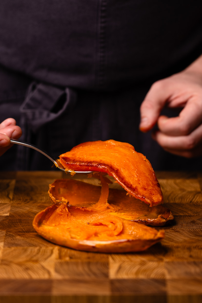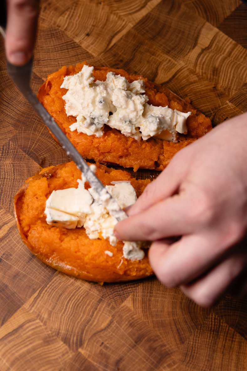 Виймаємо м'якоть ложкою та розминаємо виделкою і викладаємо у батат.
