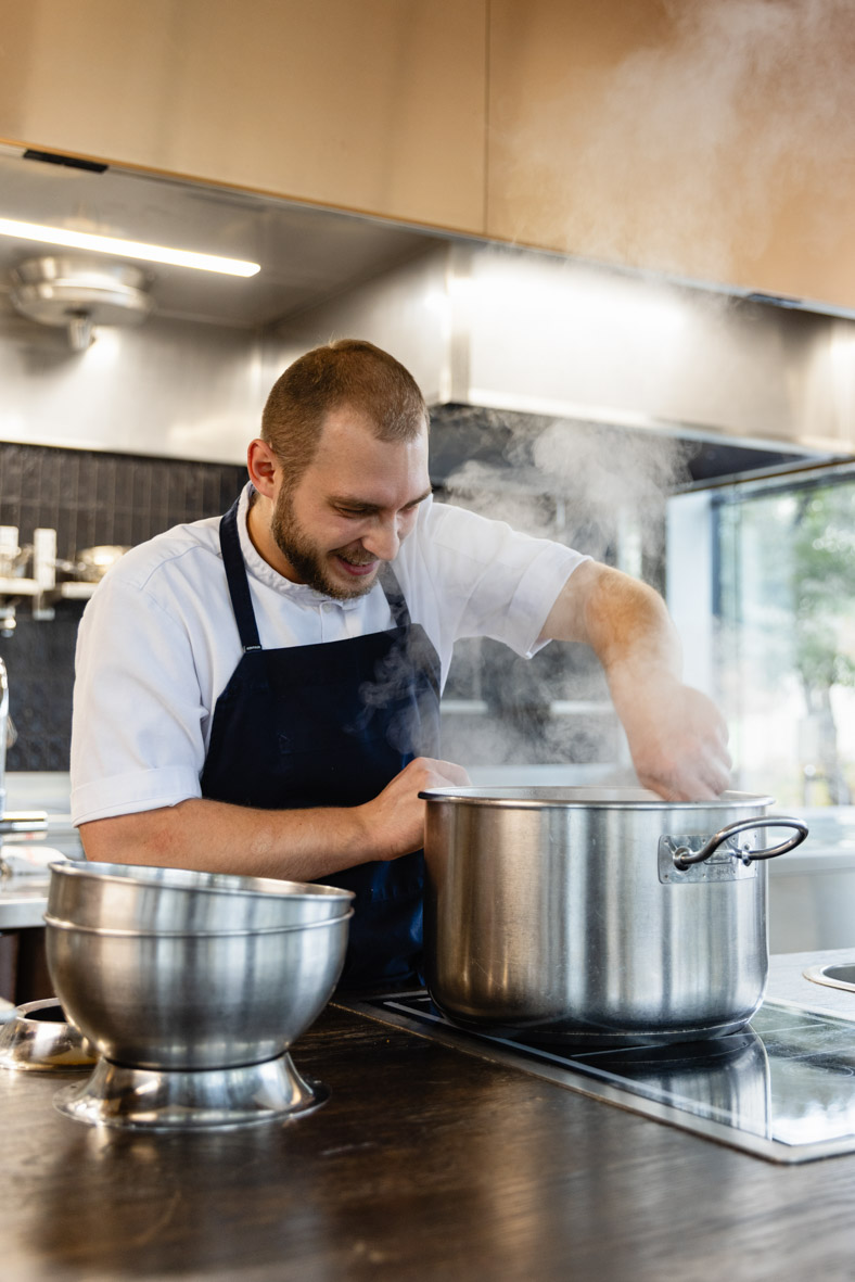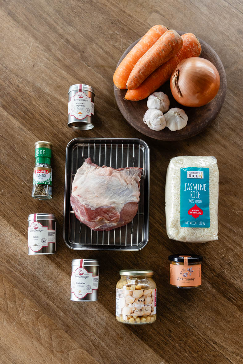 Додаємо цибулю та обсмажуємо, потім спеції і прогріваємо разом з мʼясом та овочами, додаємо воду і консервований нут. Тушкуємо на маленькому вогні протягом 40 хвилин.