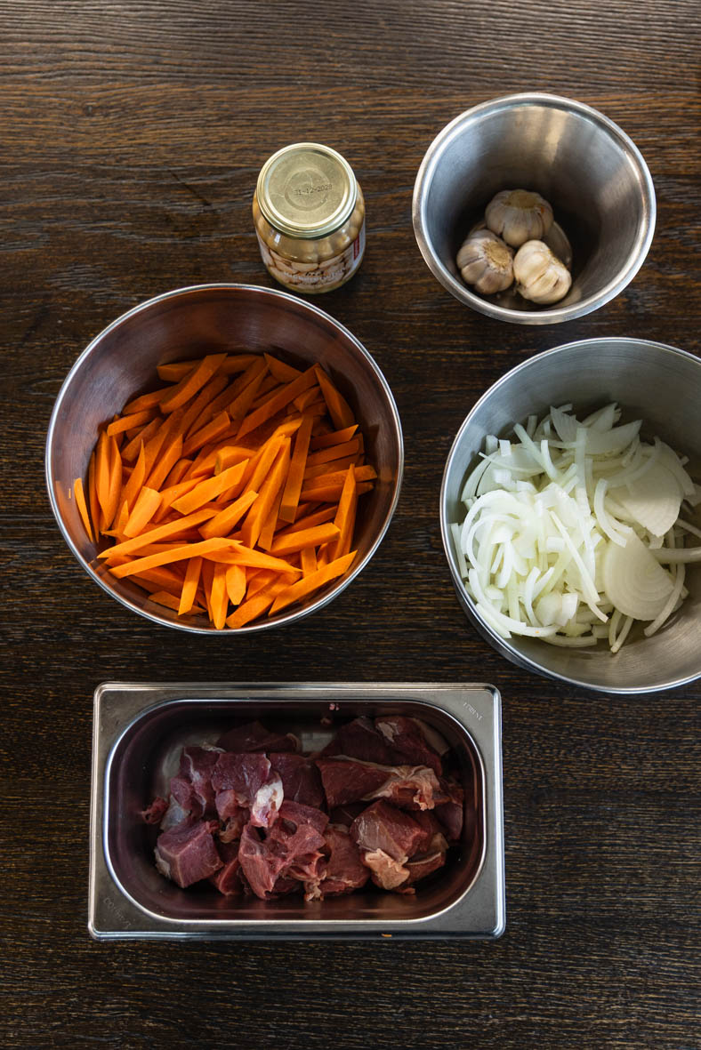 Нарізаємо овочі та м'ясо на крупні шматочки.