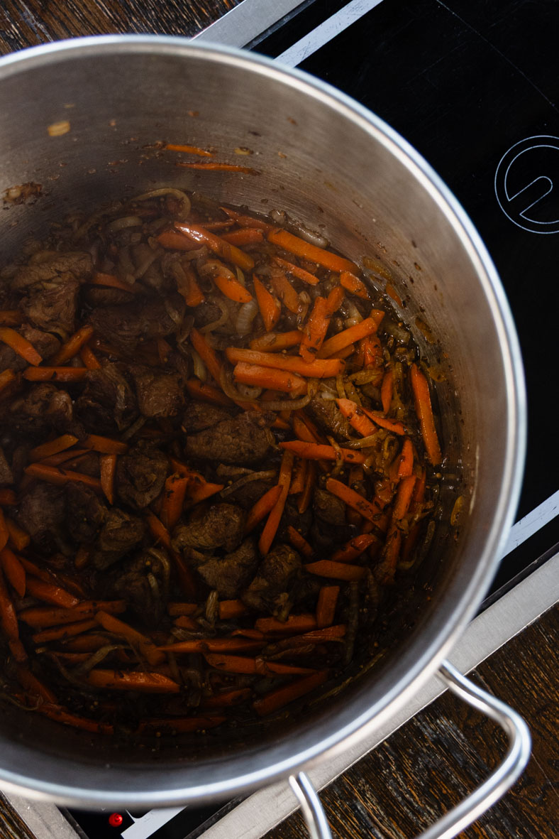 У казані або каструлі додаємо олію для смаження, прогріваємо та обсмажуємо м'ясо до золотистого кольору, після — додаємо моркву.