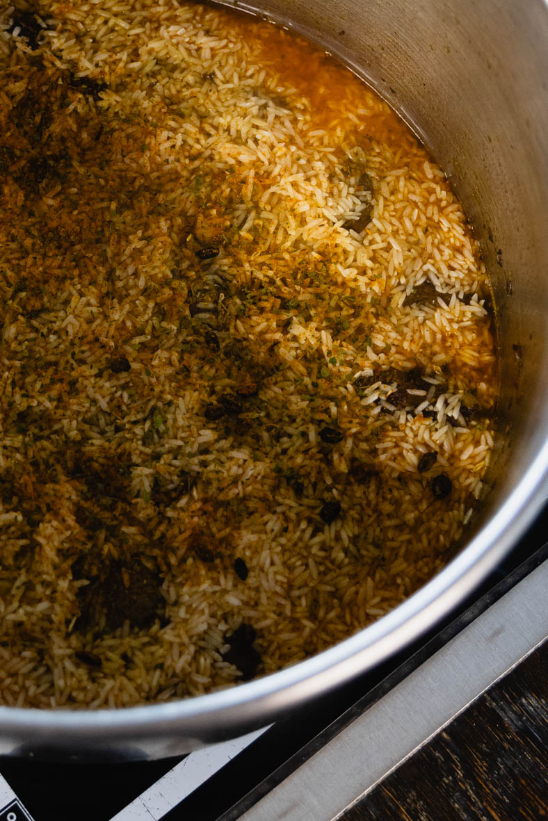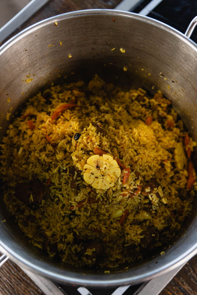 Викладаємо 2 головки часнику. Додаємо окріп до повного покривання рису та збільшуємо вогонь.Коли більша частина рідини випарувалися, збираємо рис біля стінок каструлі до центру (робимо невелику гірку). Накриваємо кришкою і зверху рушником. Залишаємо на 10-15 хвилин.