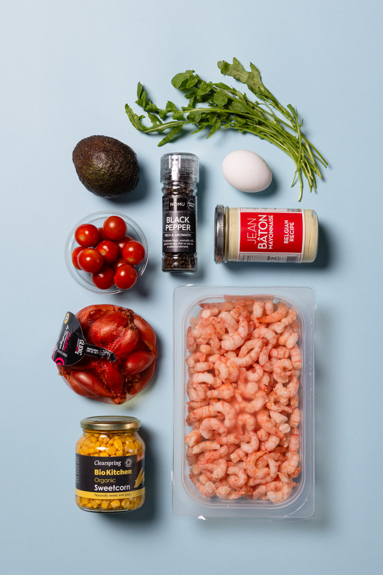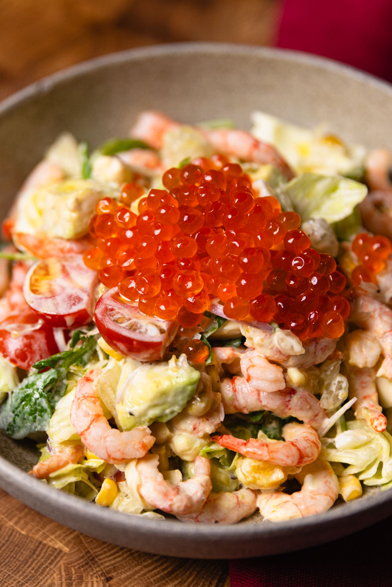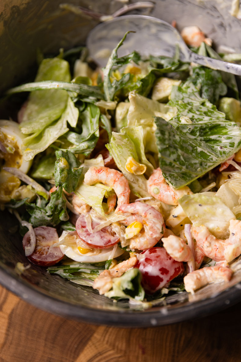 Додаємо у глибоку ємність ромен, руколу, кукурудзу, сіль та перець. Додаємо памело та креветки, майонез та перемішуємо.