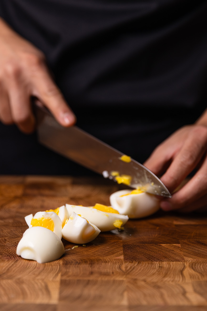 Нарізаємо авокадо на кубики. Шалот та яйця подрібнюємо.