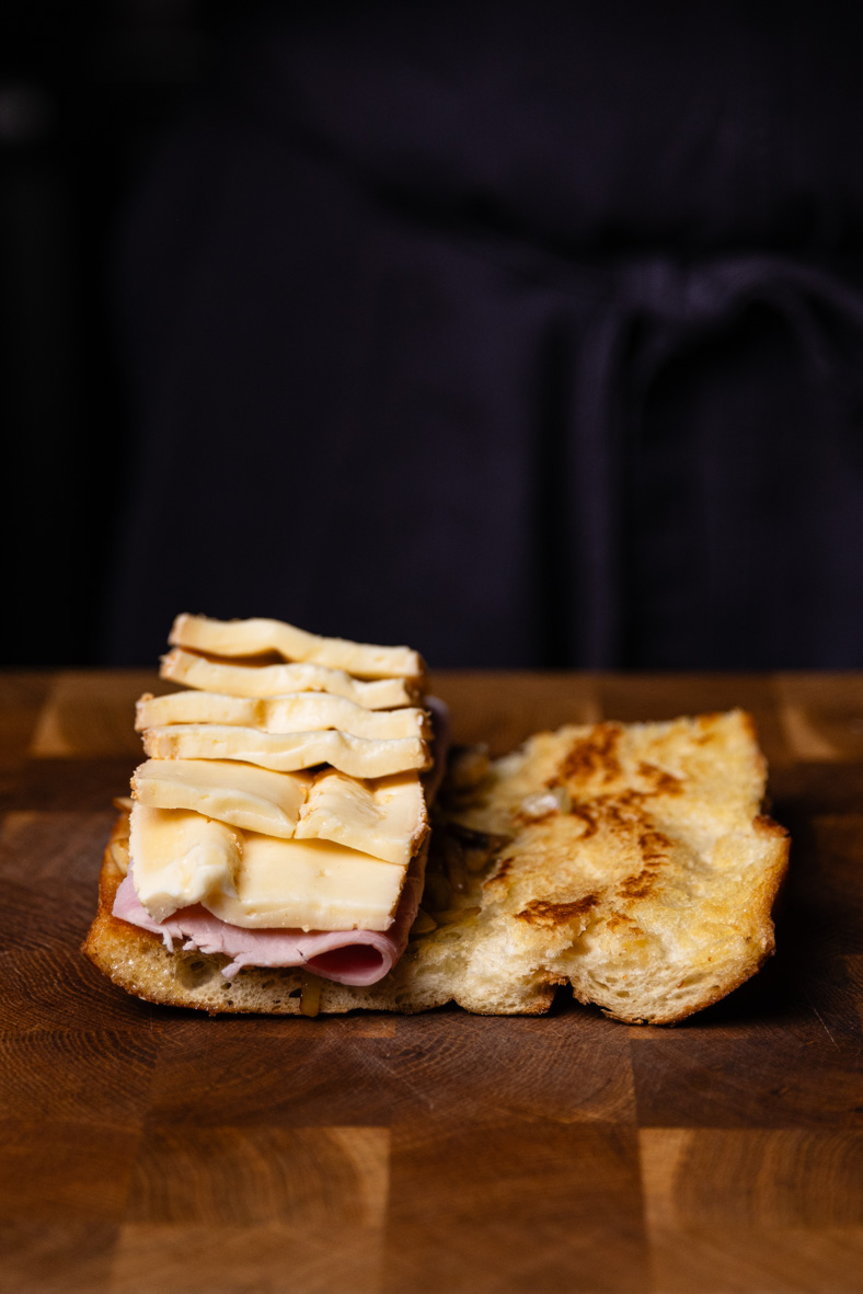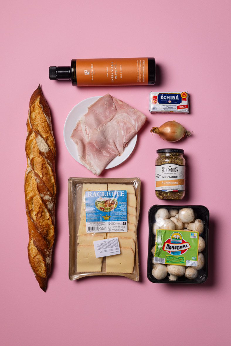 Розрізаємо багет вздовж, але не до кінця (ніби розкриваємо). Змащуємо вершковим маслом та злегка обсмажуємо на пательні. Одну сторону багета змащуємо гірчицею та додаємо обсмажену цибулю з печерицями. Викладаємо слайси окіста та шматочки сира раклет і відправляємо у духовку на 170 градусів до моменту поки сир не почне плавитися. Дістаємо з духовки, складаємо.