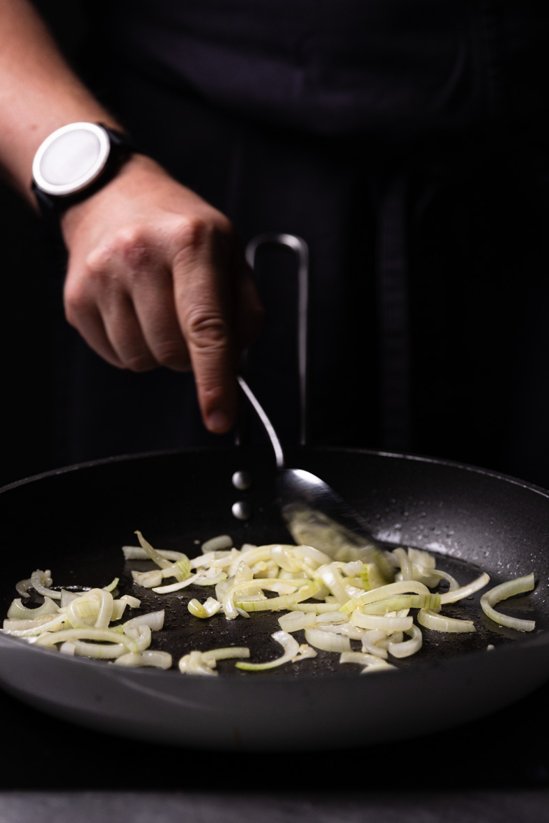 На розігріту пательню додаємо вершкове масло та обсмажуємо цибулю протягом 2 хвилин.