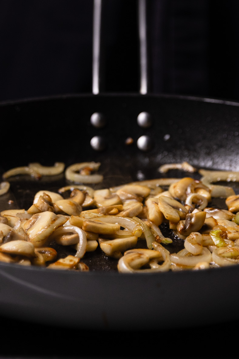 Додаємо печериці та сіль і обсмажуємо до золотистого кольору.