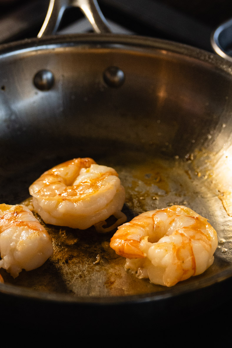 Обсмажуємо креветки. Нарізаємо зелену цибулю. Собу заправляємо кунжутною олією та соєвим.