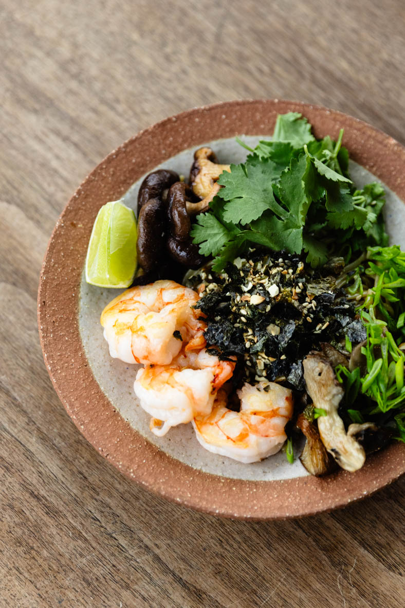 Викладаємо на тарілку собу, креветки та гриби, кінзу та цибулю. Відрізаємо для подачі лайм. Посипаємо фурікаке. Смачного!